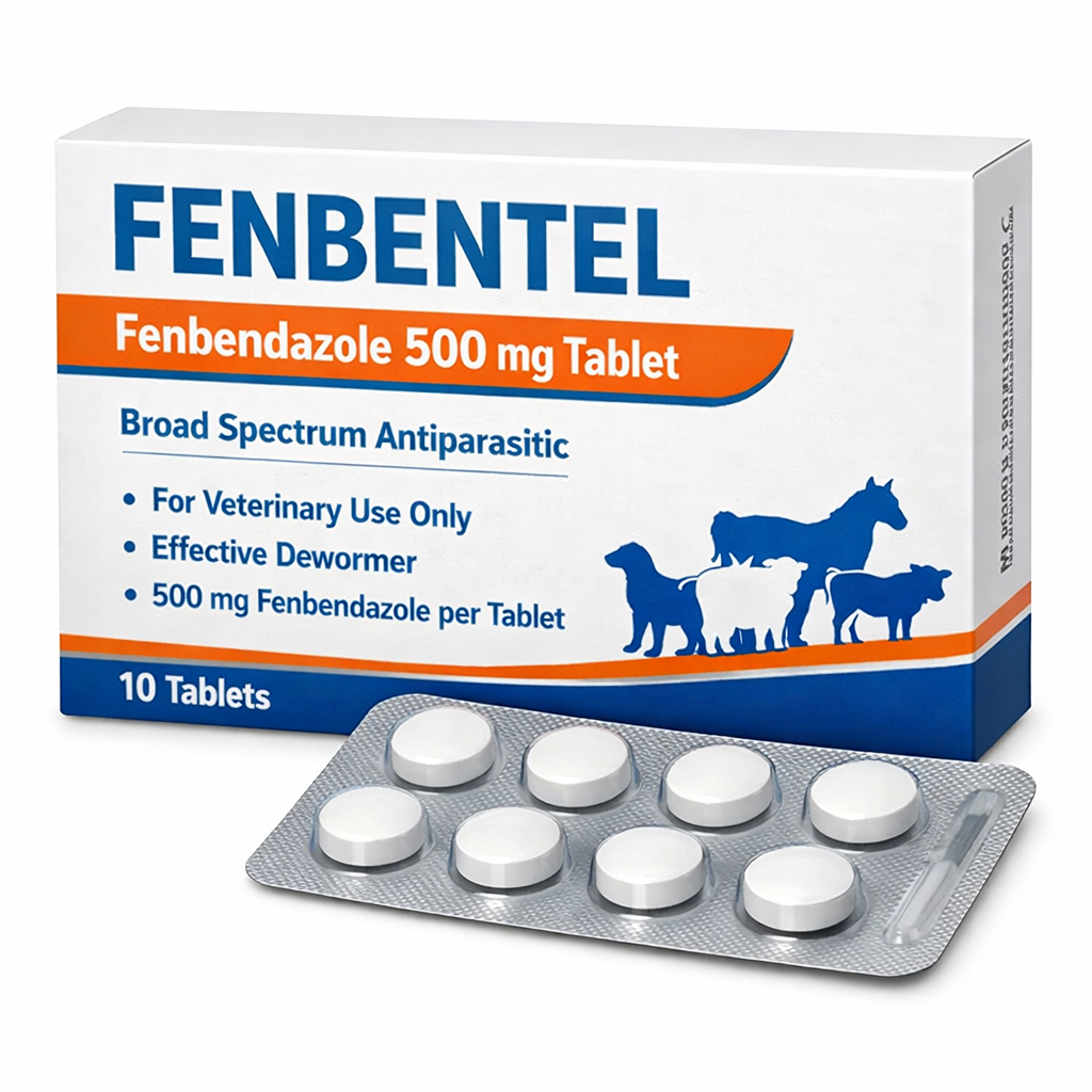 Fenbentel 500 mg contains Fenbendazole, an antiparasitic medication commonly used for the treatment of parasitic worm infections in veterinary practice.