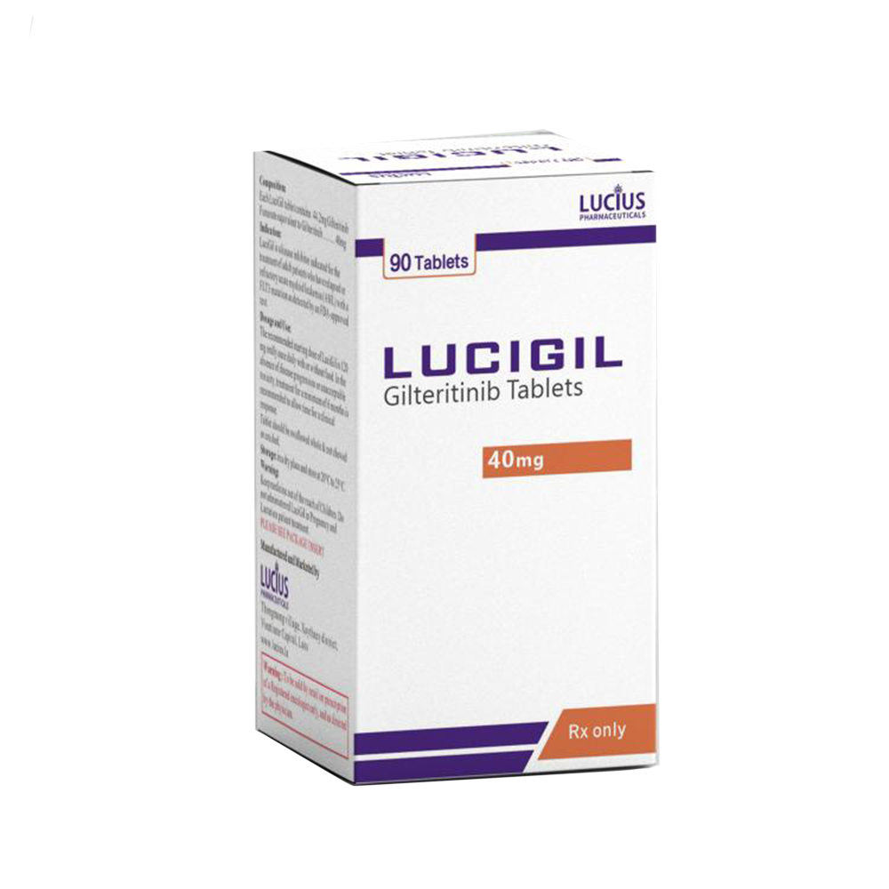 LuciGil is used to treat relapsed or refractory acute myeloid leukemia with FLT3 mutation. Active Ingredient Gilteritinib inhibits FLT3 receptor signaling. Uses of LuciGil • FLT3-positive AML How LuciGil Works It blocks FLT3 pathways responsible for cancer cell proliferation. How to Use LuciGil • Take once daily Possible Side Effects • Fatigue • Elevated liver enzymes Precautions • Monitor heart rhythm • Regular blood tests Safety Information Use under medical supervision. Storage • Store at room temperature • Protect from moisture and sunlight • Keep out of reach of children