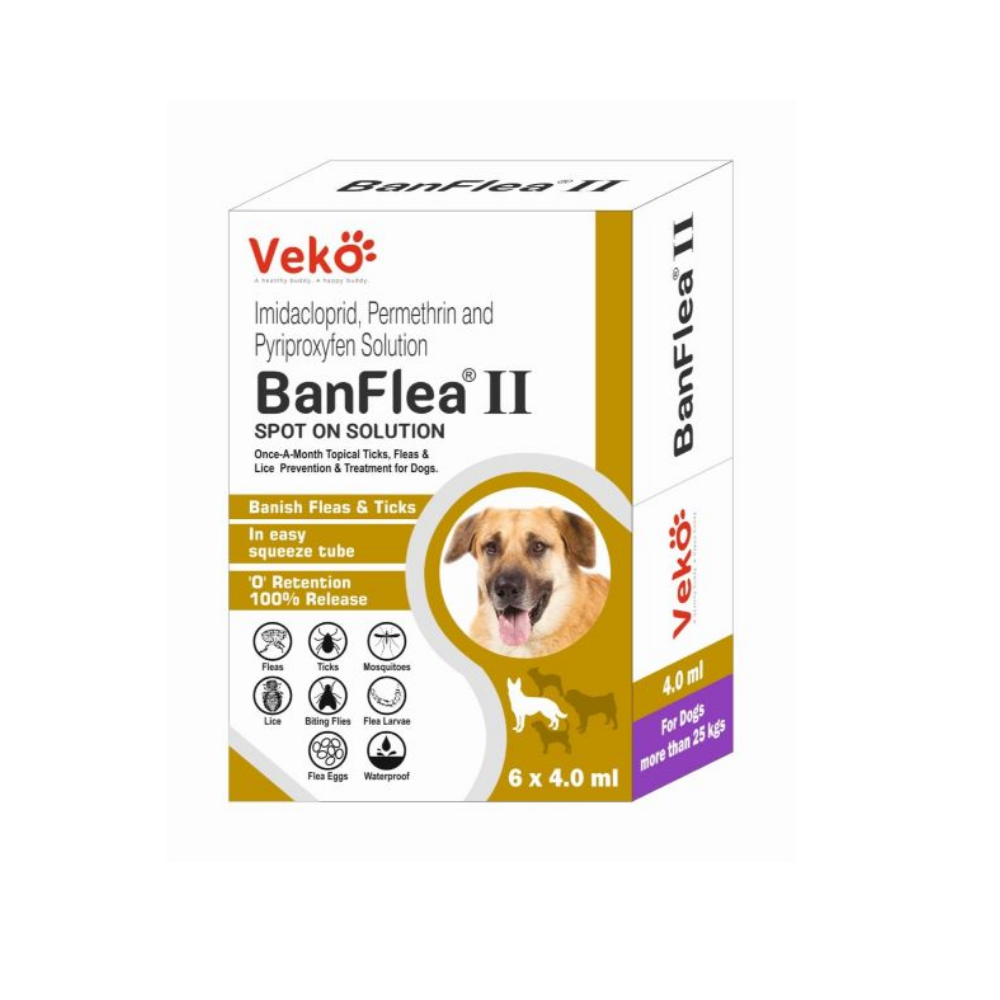 INDICATIONS: For the prevention and treatment of Ticks, Fleas, Mosquitoes, Biting Flies and Lice: Repels and kills ticks, including Deer ticks (vector of Lyme disease and anaplasmosis),American dog ticks (vector of Rocky Mountain spotted fever, tularemia and ehrlichiosis), Brown dog ticks (vector of ehrlichiosis, anaplasmosis, bartonellosis, canine hemoplasmosis, babesiosis and Rocky Mountain spotted fever), and Lone Star ticks (vector of ehrlichiosis and tularemia). Repels and kills all life stages of fleas. Prevents fleas on treated dogs from infesting your home. Kills fleas within 12 hours and continues to prevent infestations for a month. Prevents development of fleas, flea eggs, pupae and larvae for a month. Larval flea stages in the dog’s surroundings are killed following contact with a BanFlea ® II treated dog. Repels biting flies and kills chewing lice. Waterproof - remains effective even if pet gets wet . Convenient, once-a-month application