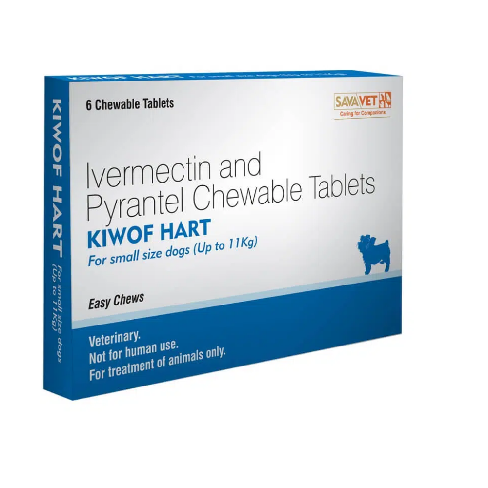 Kiwof hart tablets from savavet is used in the treatment and prevention of heartworm disease in dogs. It kills and expels heartworms effectively. Heartworm disease caused by Dirofilaria immitis, a parasitic roundworm causes immense damages to heart and lungs and this tab helps in eliminating such worms. It acts on both larvae as well as adult heart worms. It also helps control ascaris and hookworm infections. Usual dosage is 1 chewable tab per month or as advised by veterinarian. Ingredients: Ivermectin and pyrantel.
