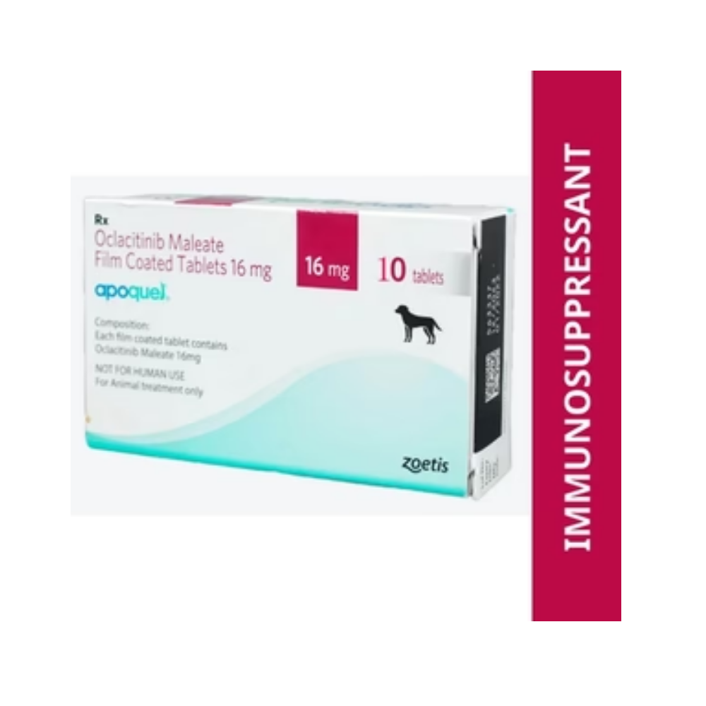 Zoetis Apoquel 16mg Tablet is a cutting-edge medication specifically formulated to provide relief from allergic dermatitis and atopic dermatitis in dogs. Powered by the active ingredient Oclacitinib, Apoquel quickly alleviates itching and inflammation, allowing your dog to enjoy a more comfortable and itch-free life. This fast-acting medication targets the source of the itch at the cellular level, offering effective relief within hours of administration. Suitable for dogs 12 months and older, Apoquel is a trusted choice for managing chronic and acute allergic skin conditions.