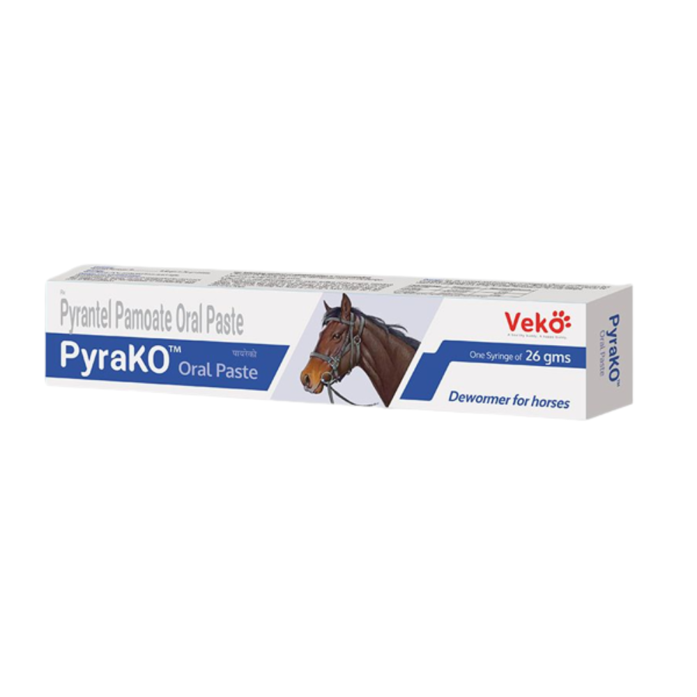 PYRAKO ORAL PASTE, a premium product from VEKO, is an essential dewormer in the veterinary medicine category, specifically formulated for horses. Containing the active ingredient Pyrantel Pamoate, this paste is effective against a range of parasitic infections. Committed to animal health, Animeal is proud to offer PYRAKO ORAL PASTE, ensuring the well-being of horses with trusted and effective solutions.