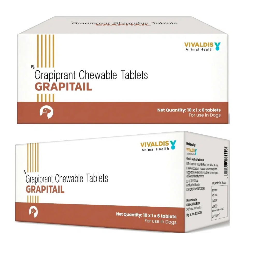 Vivaldis Grapitail 100mg Tablets are specifically formulated to provide effective relief from pain and inflammation associated with osteoarthritis in dogs. Grapiprant, the active ingredient, is a non-steroidal anti-inflammatory drug (NSAID) designed to target and alleviate discomfort in canines, allowing them to maintain a higher quality of life. Grapitail is suitable for dogs experiencing joint pain, stiffness, and reduced mobility due to osteoarthritis. Composition : Grapiprant Class: Non Steroidal Anti inflammatory Drug Uses of Grapitail Grapiprant Tablet Treatment of pain and inflammation associated with osteoarthritis in dogs. Management of chronic pain in aging dogs or dogs with joint issues.